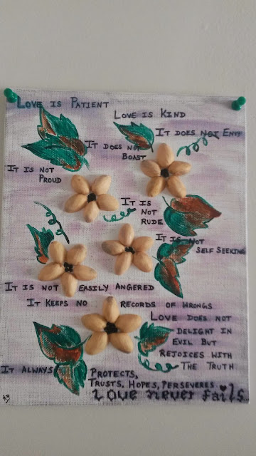 I stuck the shells using glue on a canvas board like a flower. The extra art work is easy, as it was the leaves that I had to draw and paint. Gave a background colour. I picked up a verse from the bible about love and wrote it with a marker.